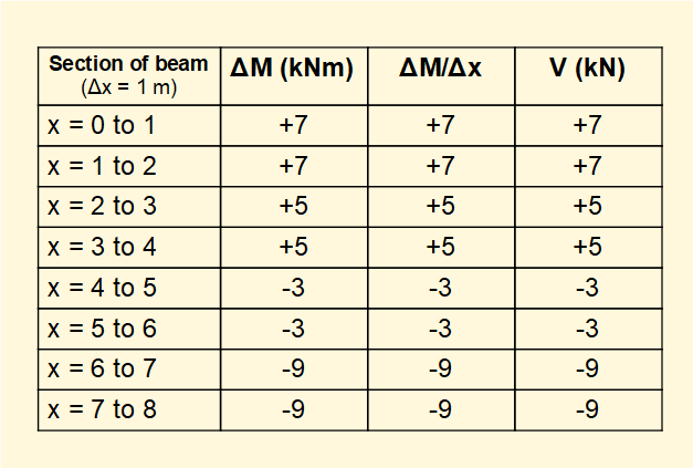 We can now construct the bending moment diagram for the beam in this example noting that the slope of M is constant between the point loads and equals V (as shown in the above table).