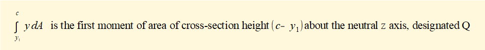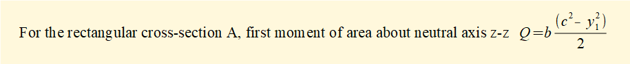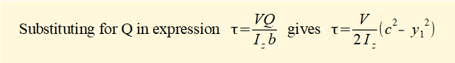 Distribution of τ across the section for values of y1 from -c to +c is a quadratic function as shown below. τmax occurs at the neutral axis where y1 = 0 and τ = 0 where y1 = ±c. Note that locations of minimum and maximum shear bending stresses are the reverse of normal bending stresses.