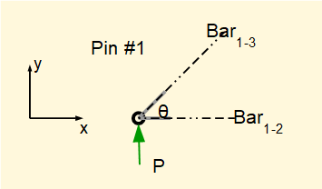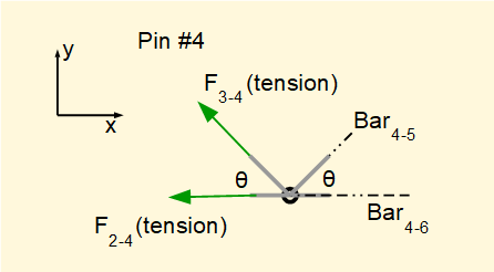 Below is the free body diagram for pin #1 which includes short stubs of each connected bar (subscripts indicate the linked joints). Note the x and y axes which define +ve and - ve directions for forces. Also note that θ = 45 deg.