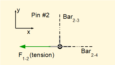 At pin #1 we showed that F1-2 puts bar1-2. in tension. This means that F1-2 exerts a pulling force on pin #2 in the -ve direction.