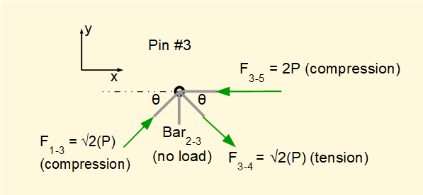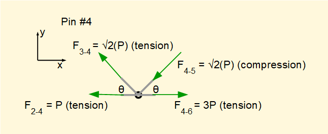 Gives a pushing compression force (absolute value) F4-5 = F3-4 = √2(P)Take Σ of horizontal forces = 0