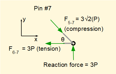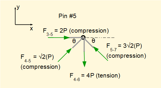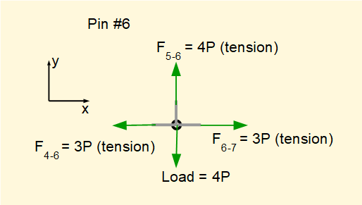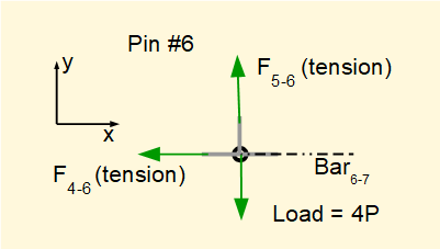 We know bar4-6 and bar5-6 are in tension. Taking Σ of vertical forces = 0 confirms that F5-6 = +4P as determined for pin #5.
