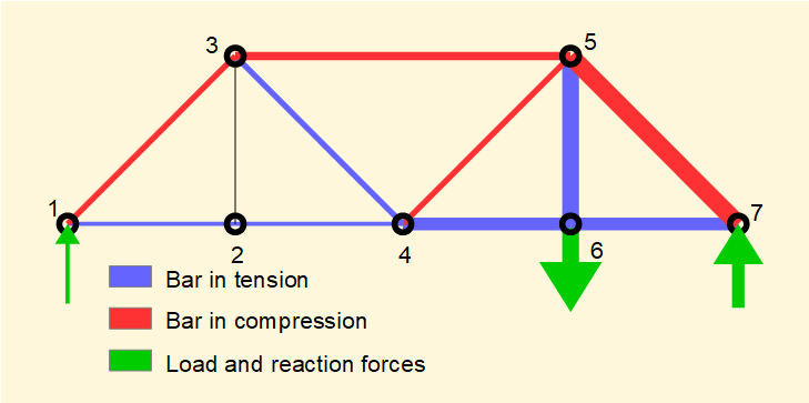 It is interesting to visualise in the diagram below forces acting on individual bars. Width of the line representing each bar is proportional to the force acting on the bar as are the arrows representing the applied force and reactions.