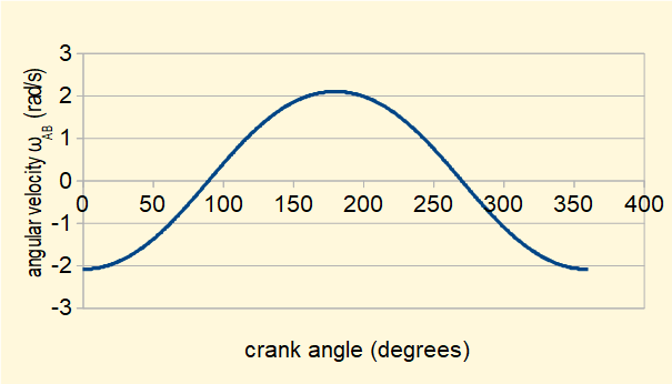 The plot below shows ||ωAB|| the angular velocity of the connecting rod AB against crank angle θ for one crank cycle from the relation ||ωAB|| = ||vB/A||.AB computed from the derived expression for ||vB/A||.
