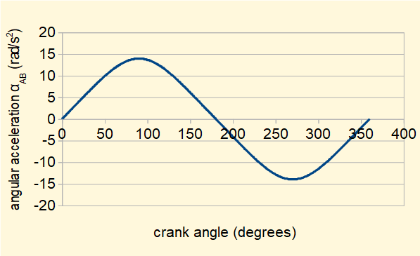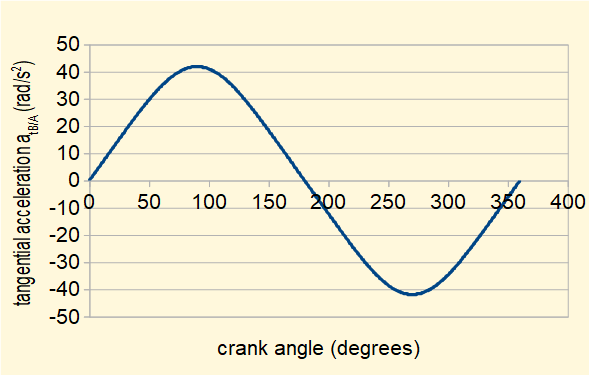 The two plots below for show respectively ||atB/A|| the tangential acceleration of point B relative to point A computed from the derived expression above and angular acceleration ||αAB|| of connecting rod AB, both plots against crank angle for one crank cycle. The relationship between the two quantities is ||atB/A|| = ||αAB||.AB. This relationship in general terms is the vector cross-product at = α x r. As in the case of vt = ω x r, r is the position vector of the rotating point relative to its centre of rotation.