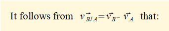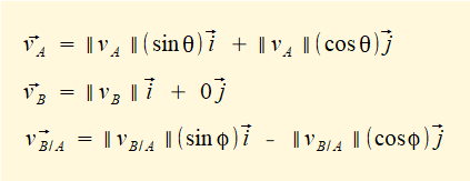 We can express vA, vB and vB/A in terms of unit vectors i and j as follows (taking particular note of signs according to the defined directions of unit vectors).