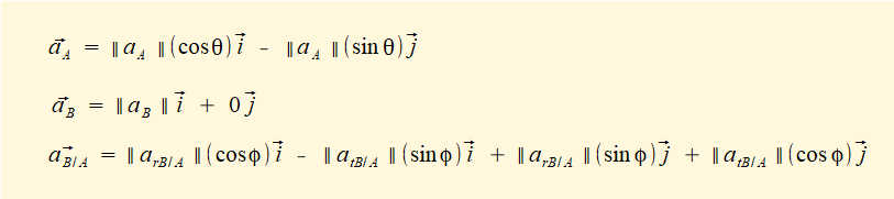 We can express aA, aB and aB/A in terms of unit vectors i and j as follows (taking particular note of signs according to the defined direction of unit vectors).