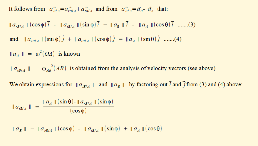 The expression for ||atB/A|| is new and allows us to examine the characteristic of angular acceleration of the connecting rod as vector αAB through the crank cycle since ||αAB|| = ||atB/A||.L