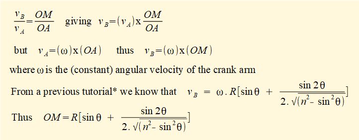 For convenience we used a crank angle = 50° for the above examples but crankshaft torque varies continuously throughout the full crank cycle. In previous tutorials we developed general expressions for velocities and accelerations of elements in the mechanism. For crankshaft torque there is a very convenient general expression derived from the velocity pole diagram (see above) where we noted that: