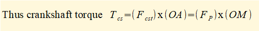 Now add to this diagram the external horizontal force FP applied to the slider and the resultant force Fcst at crank pin A perpendicular to crank arm OA which delivers torque Tcs to the crankshaft such that Tcs = Fcst.OA
